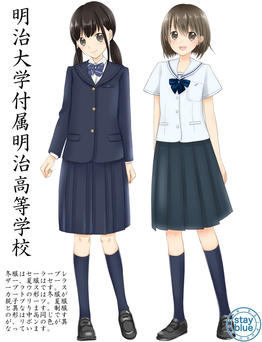 Stayblue 学校制服図鑑さんのツイート No 724 明治大学付属明治高校 東京都調布市 の制服イラスト 冬服 は珍しいセーラーブレザー 襟がセーラー襟で形はブレザーです また 冬服スカートが親子プリーツであることも特徴 夏服はセーラーブラウスです 中高同じ制服
